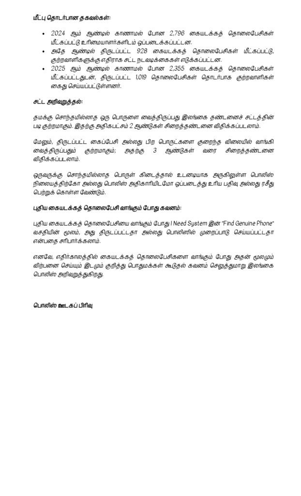அவ்வாறு காணாமல் போன அல்லது திருடப்பட்ட கையடக்க தொலைபேசிகளின் ஊடாக சிலர் சட்டவிரோத செயற்பாடுகளை முன்னெடுக்க கூடிய வாய்ப்புள்ளதால், அவ்வாறான சந்தர்ப்பங்களில் பொதுமக்கள் எடுக்க வேண்டிய நடவடிக்கைகள் தொடர்பில் பொலிஸ் திணைக்களம் அறிவுறுத்தியுள்ளது.