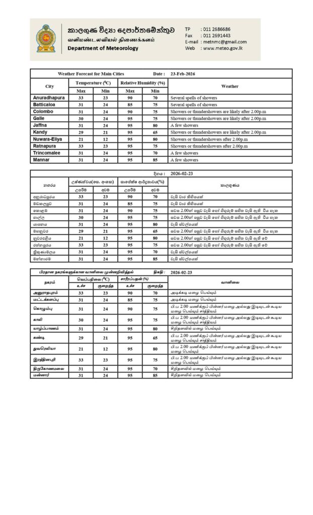 2026 பெப்ரவரி 23 ஆம் திகதிக்கான வானிலை முன்னறிவிப்பு 2026 பெப்ரவரி 23 ஆம் திகதி அதிகாலை 05.30 மணிக்கு வெளியிடப்பட்டது.