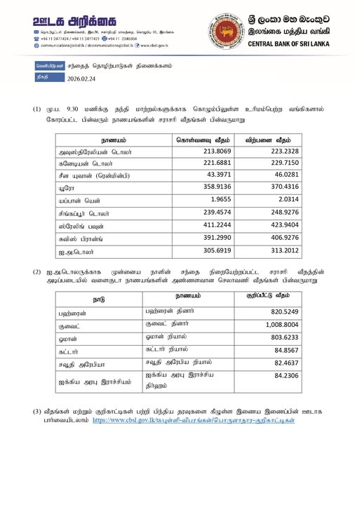 அதன்படி, ஏனைய வெளிநாட்டு நாணய மாற்று விகிதங்கள் தொடர்பாக இன்று (24.02.2026) மத்திய வங்கியினால் வெளியிடப்பட்டுள்ள தகவல்கள் கீழே தரப்பட்டுள்ளது.