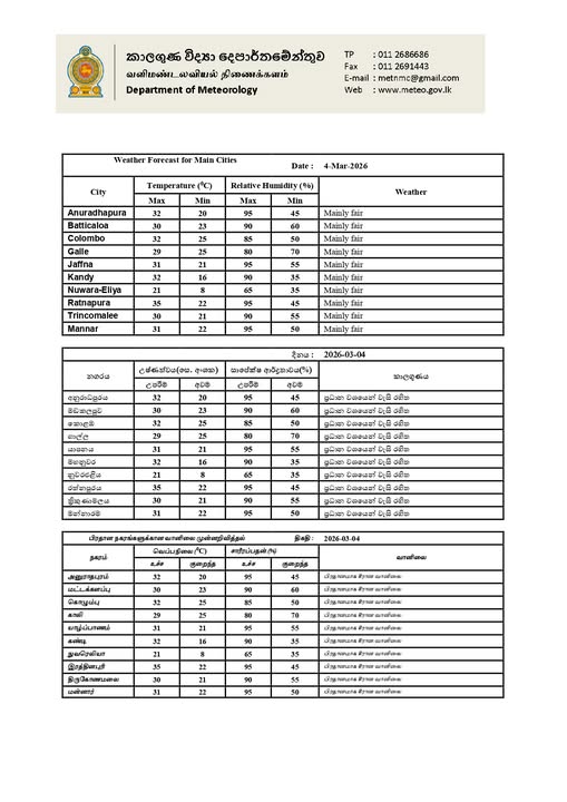 2026 மார்ச் 04 ஆம் திகதிக்கான வானிலை முன்னறிவிப்பு 2026 மார்ச் 04 ஆம் திகதி அதிகாலை 05.30 மணிக்கு வெளியிடப்பட்டது.