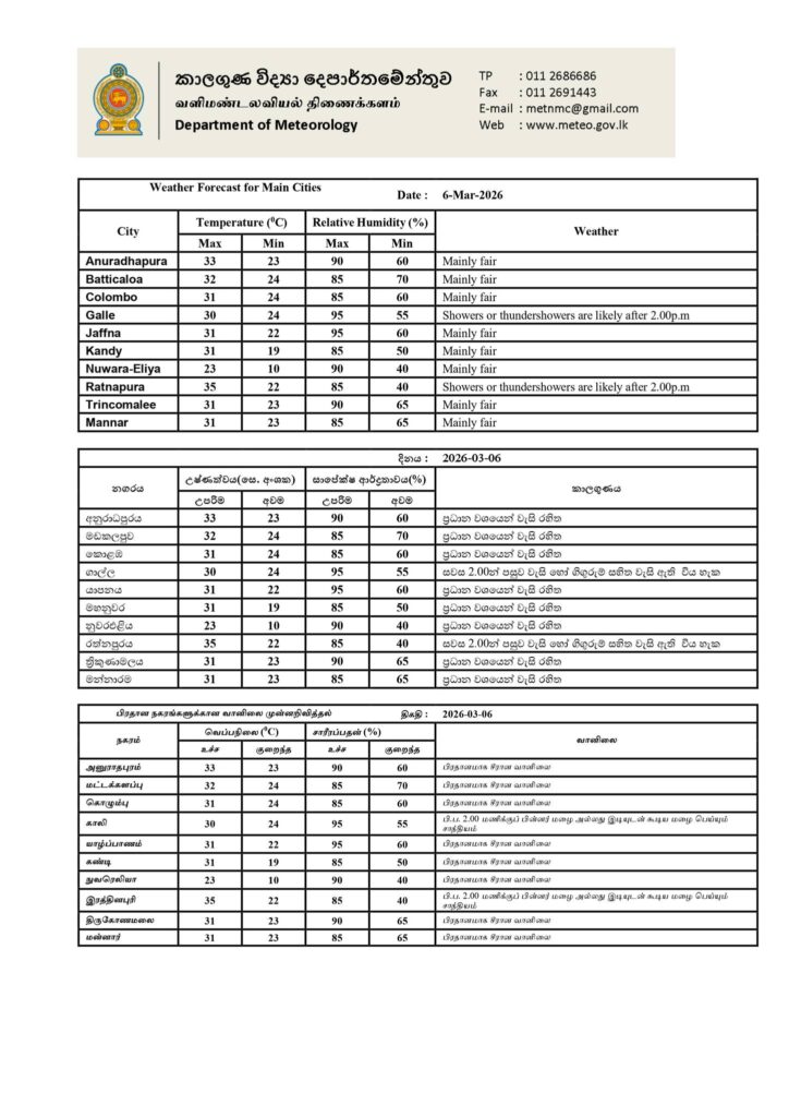 2026 மார்ச் 06 ஆம் திகதிக்கான வானிலை முன்னறிவிப்பு 2026 மார்ச் 06 ஆம் திகதி அதிகாலை 05.30 மணிக்கு வெளியிடப்பட்டது.