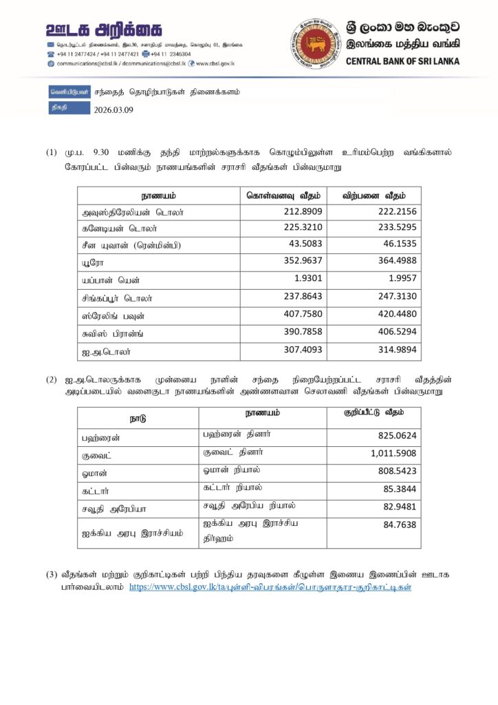 அதன்படி, ஏனைய வெளிநாட்டு நாணய மாற்று விகிதங்கள் தொடர்பாக இன்று (09.03.2026) மத்திய வங்கியினால் வெளியிடப்பட்டுள்ள தகவல்கள் கீழே தரப்பட்டுள்ளது.