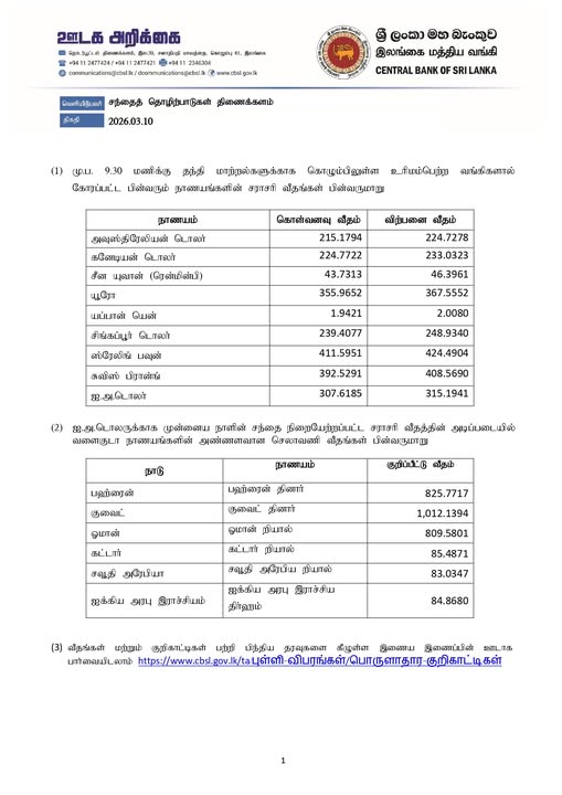 இலங்கை மத்திய வங்கி இன்று (10.03.2026) வெளியிட்டுள்ள நாணய மாற்று விகிதத்தின் அடிப்படையில்,