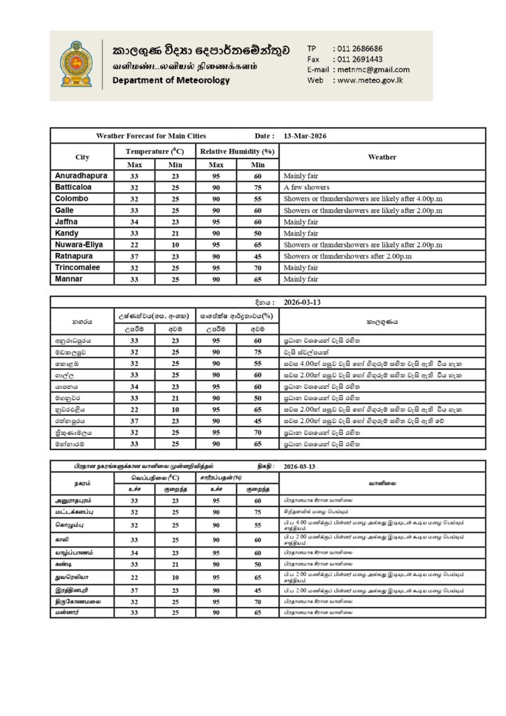 2026 மார்ச் 13 ஆம் திகதிக்கான வானிலை முன்னறிவிப்பு 2026 மார்ச் 13 ஆம் திகதி அதிகாலை 05.30 மணிக்கு வெளியிடப்பட்டது.