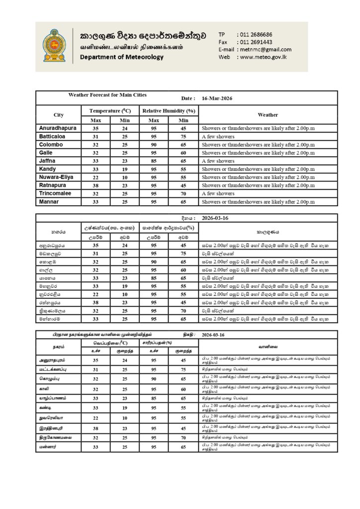 2026 மார்ச் 16ஆம் திகதிக்கான வானிலை முன்னறிவிப்பு 2026 மார்ச் 16ஆம் திகதி அதிகாலை 05.30 மணிக்கு வெளியிடப்பட்டது.