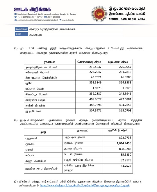 அதன்படி, ஏனைய வெளிநாட்டு நாணய மாற்று விகிதங்கள் தொடர்பாக இன்று (18.03.2026) மத்திய வங்கியினால் வெளியிடப்பட்டுள்ள தகவல்கள் கீழே தரப்பட்டுள்ளது.